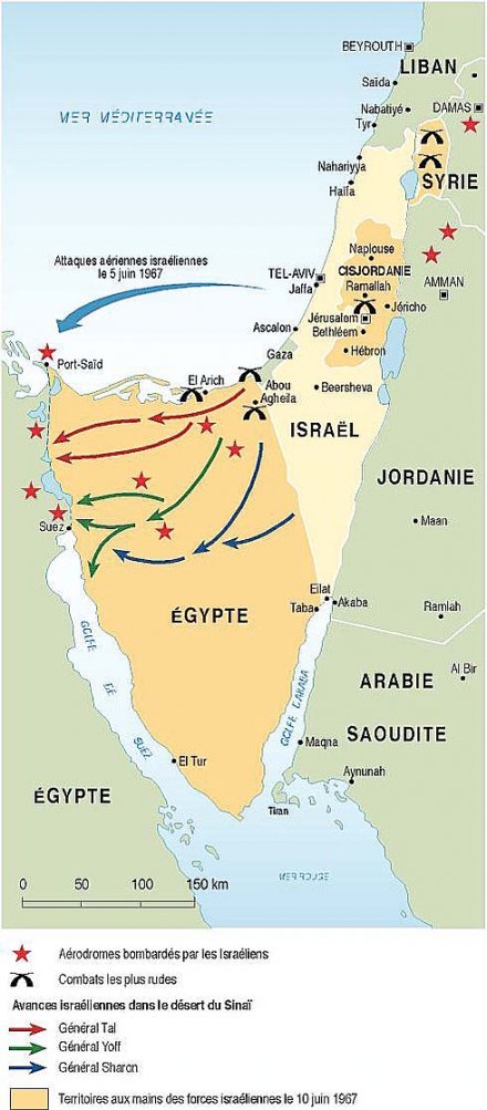 Au soir de la première journée de guerre, la moitié de l’aviation arabe est détruite au sol . Et au soir du sixième jour, les armées égyptiennes, syriennes et jordaniennes sont défaites. Les chars de Tsahal ont bousculé leurs adversaires sur tous les fronts. En moins d’une semaine, l’état hébreu a triplé sa superficie : l’Egypte a perdu la bande de Gaza et la péninsule du Sinaï, la Syrie a été amputée du plateau de Golan et la Jordanie de la Cisjordanie et Jérusalem-Est.