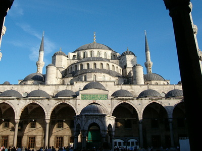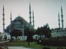 En face de la citerne , c’est la merveille des merveilles , la mosquée bleue , nous quittons nos chaussures et les gardons à la main semelle contre semelle pour ne pas souiller la mosquée .